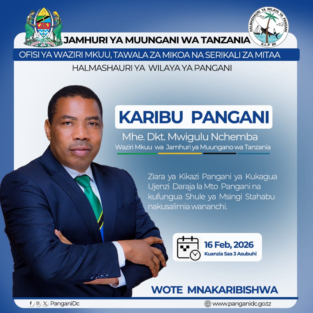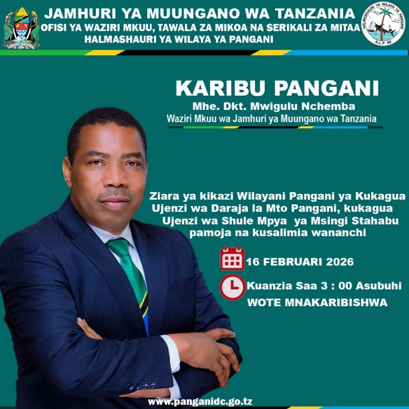 Waziri Mkuu wa Jamhuri ya Muungano wa Tanzania, Mheshimiwa Dkt. Mwigulu Lameck Nchemba (Mb), anatarajiwa kufanya ziara ya kikazi katika Halmashauri ya Wilaya ya Pangani tarehe 16 Februari 2026.